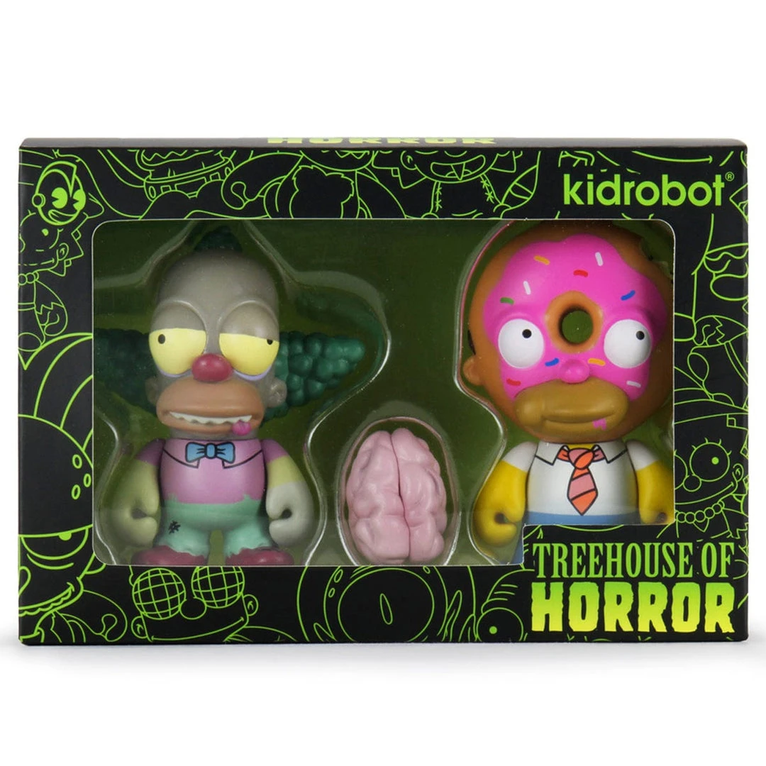Presenting The Simpsons Treehouse of Horror 2-Pack Mini Figure Set with new versions of your favorite characters from Kidrobot’s Blind Box Mini Figure Series based on the classic Halloween episodes. This 2-pack set features Frosted Pink Sprinkle Donut Homer and glow-in-the-dark Krusty the Clown Zombie 3″ Vinyl Figures with brain accessory. This special collectible 2-Pack Mini Figure Set can only be found at Kidrobot.com and IamRetro.com, while supplies last.