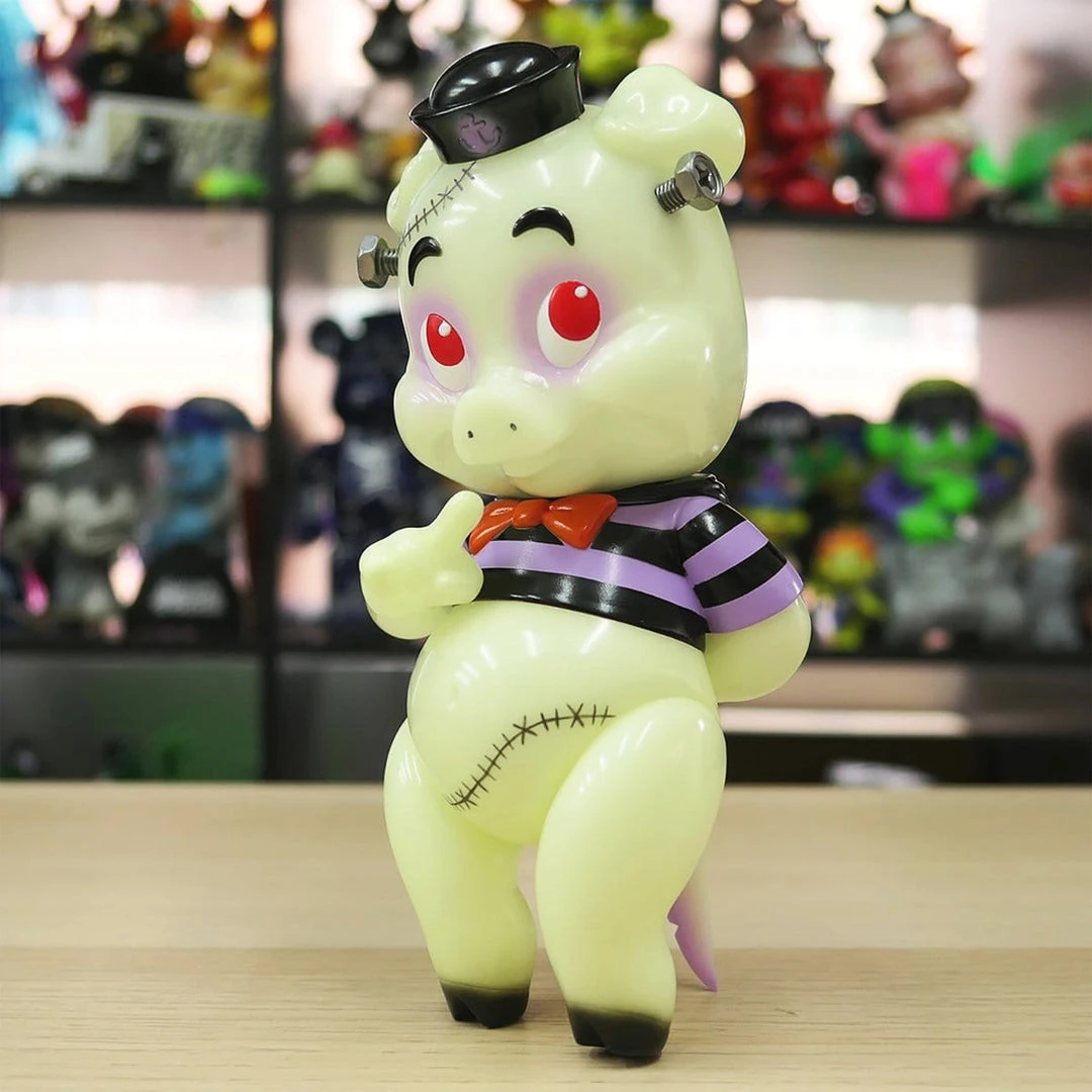 Frank Kozik’s Piggums got the “Frankenstein” treatment! Not only did Franken Piggums get real screws installed into his temple, but also got the GID skin!! Plus his stitches are hand painted by BBT one by one. The stitches on the body and face are all unique as they have been hand painted in Japan. You don’t know which one you would be getting until you receive it but it’s top notch quality.