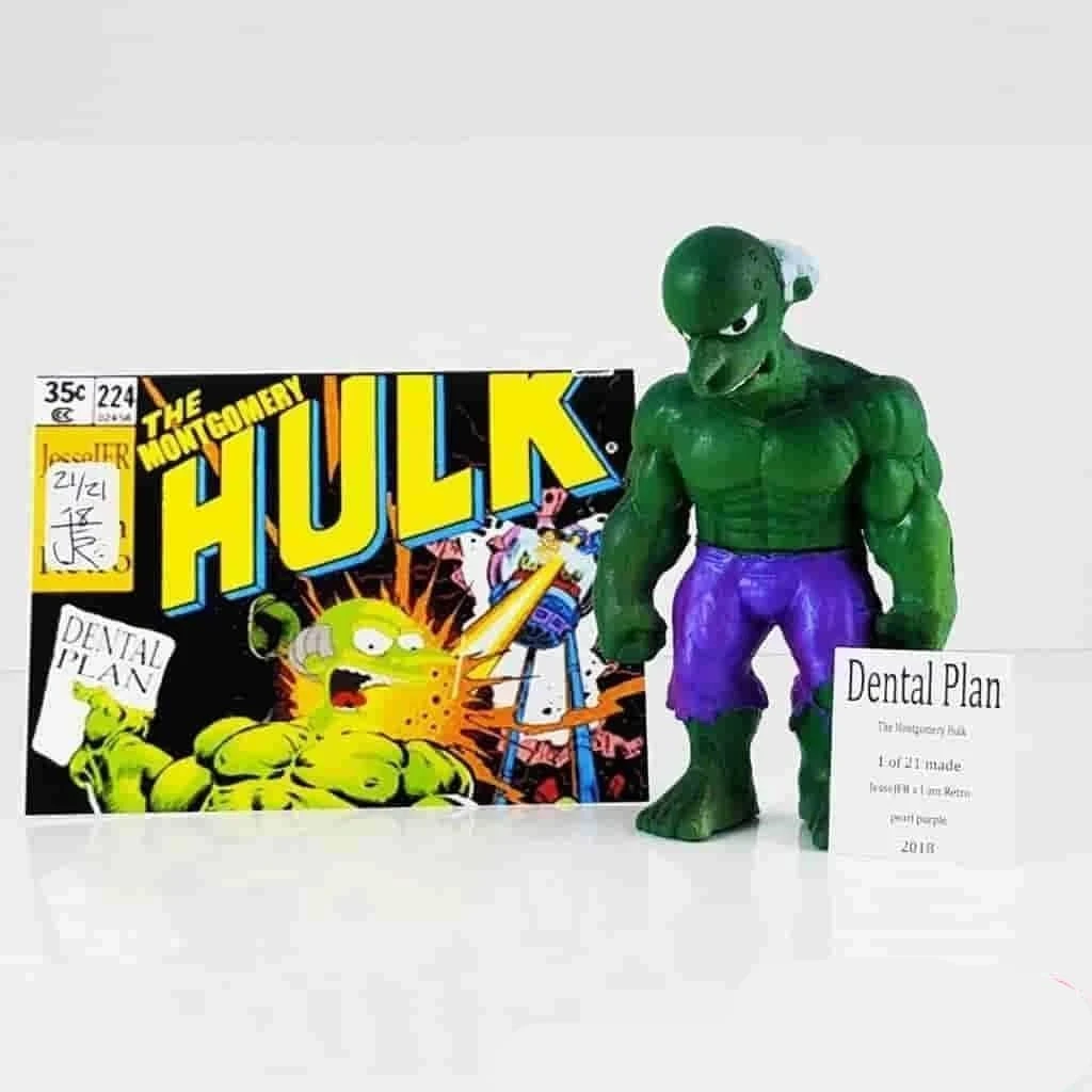 The resin Montgomery Hulk stands at 3.5 inches and is hand casted and hand painted by @JesseJFR in collaboration with us here at IamRetro. This Original First Edition includes dental plan accessory, pearlescent shorts, matching pearlescent sticker on the card topper and each unit is numbered XX/21.