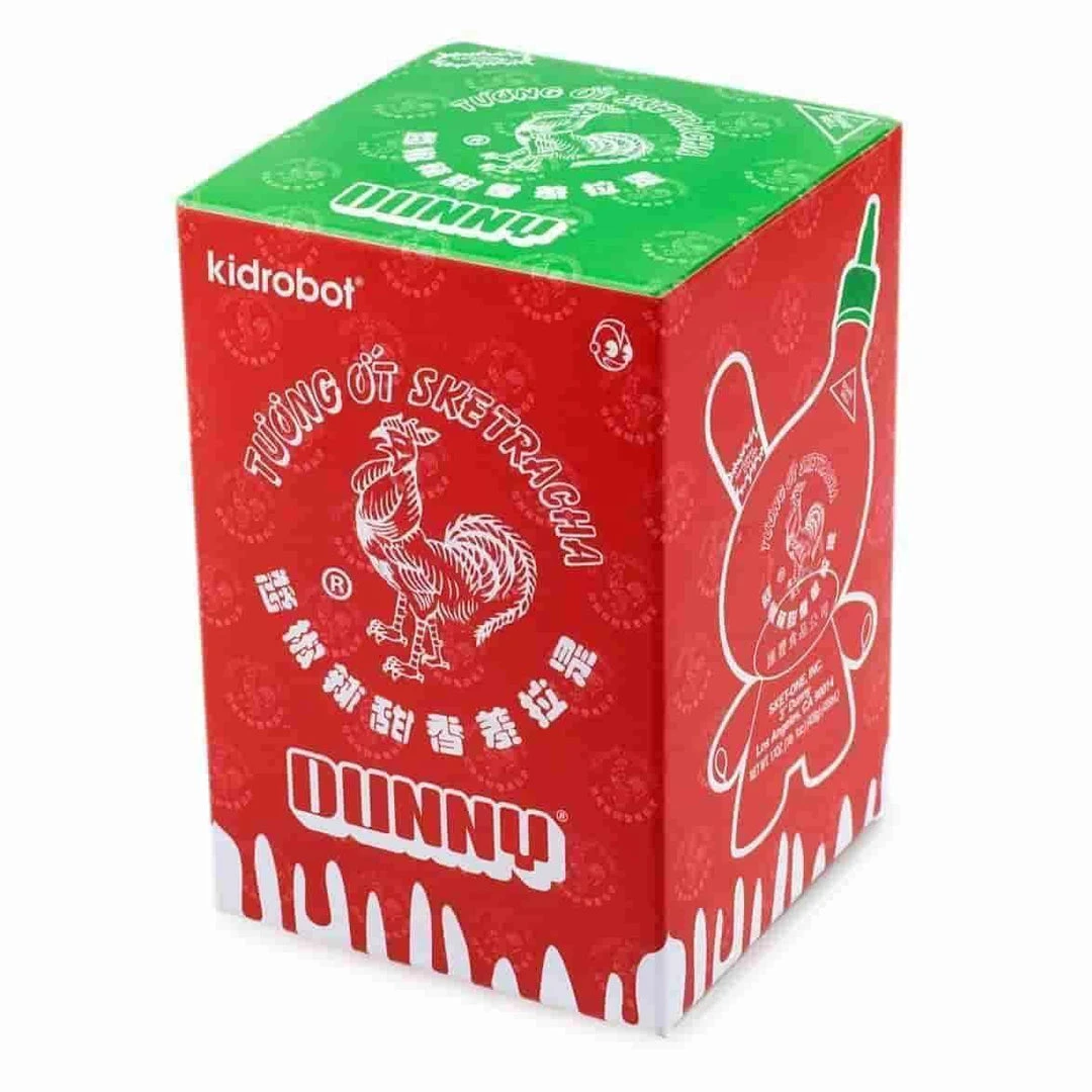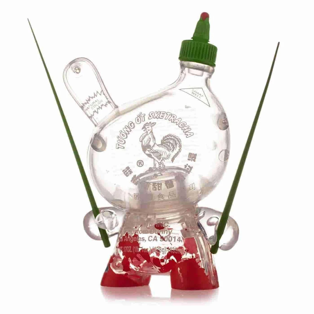 The Sketracha 3″ Dunny by LA artist, SKET ONE, is back for purchase at Kidrobot.com! This DUNNY is designed to resemble a Sriracha bottle and is outfitted perfectly with a pair of chopsticks.  In 2016, this Dunny was awarded Best Licensed Toy at the Designer Toy Awards. Spice up your DUNNY collection with both the main line red “full” DUNNY and the clear “empty” DUNNY chase piece.  This is a blind box chase… You might get the red “full” version or you may get a clear “empty” one!  Neither you or us know which one you are going to get which adds to the fun!