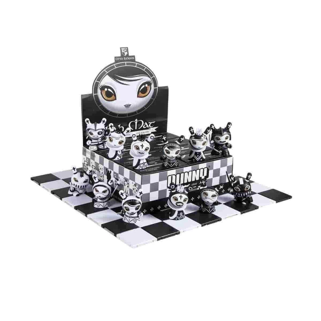 NOTE: Each display case of 8x Shah Mat Two-Packs will have 4 black Shah Mat Dunny Two-Packs and 4 white Shah Mat Dunny Two-Packs. For each 2 pack you will be able to see open window of just the Pawn color. If the Pawn is white, the other piece will be white and vice versa. There will be some figures that are more rare than others. Odds are higher for getting multiple pieces of the Rook, Knight, and Bishop. The King & Queen are more rare. The gold chase King piece (King Midas) is not guaranteed.