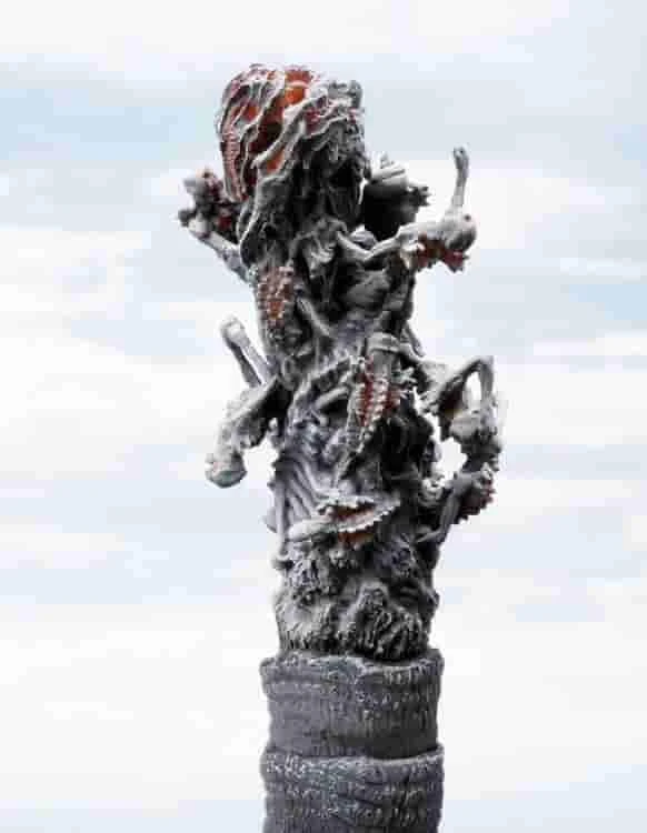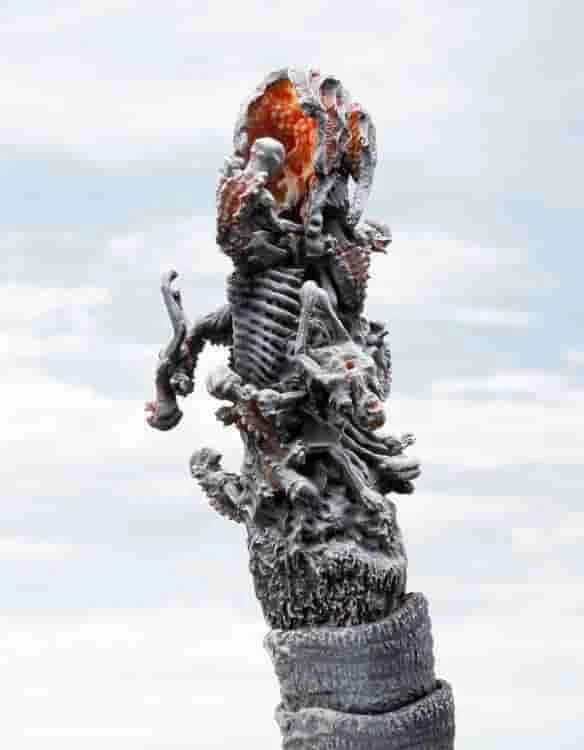 The shape of the frozen tail was created with new modeling and features humanoid creatures climbing out. This behemoth was sculpted and colored by Takayuki Takeya, the creator of the prototype tail used in the last scene.